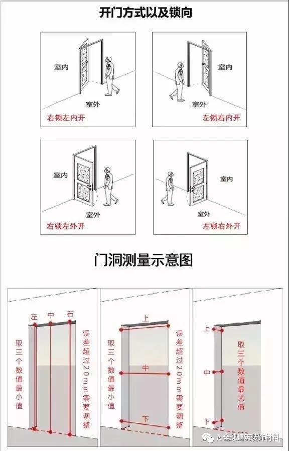 ②高度:垂直測量門洞上下之間的距離,并選取3個以上的測量點(diǎn)來測量,其中的最小值(減門框調(diào)整余量)作為門框外延寬度尺寸。注:測量中需注意地面的處理情況,同時預(yù)留地面裝修材料的厚度,以備不時之需。